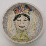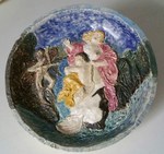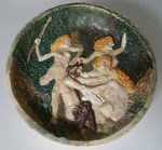 2016Bord met sater die door bronnimfen verleid wordt om in het water te komen. Reliëf, ingewassen met kleurstof en transparant glazuur.
