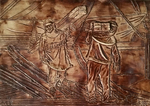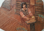 2017Bord met de marskramer van Jeroen Bosch. Reliëf, ingewassen met kleurstof en transparant glazuur.