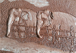 2017Bord met kudde olifanten in reliëf, ingewassen met kleurstof en transparant glazuur.